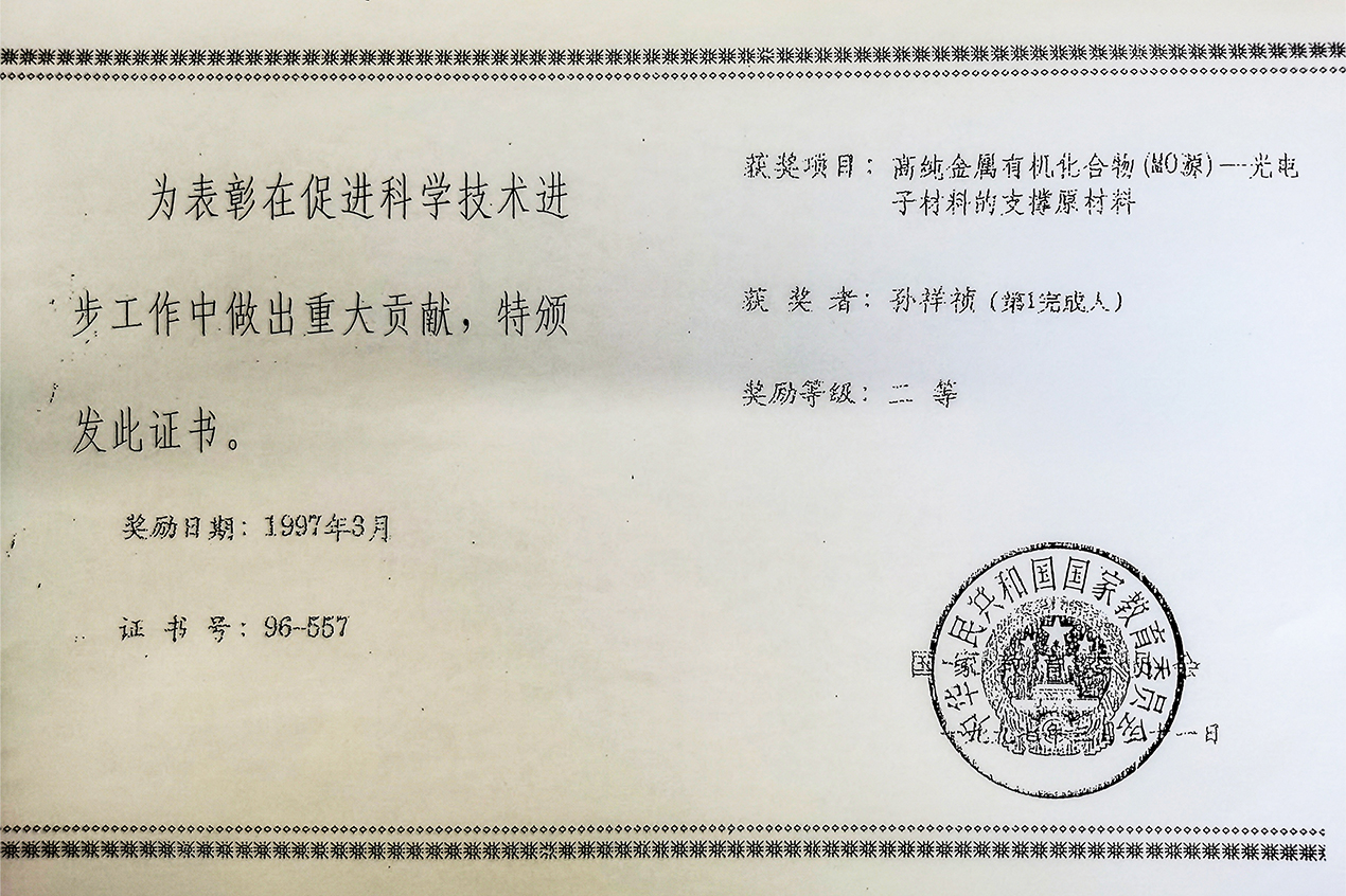 “高純金屬有機(jī)化合物(MO源)光電子材料的支撐原材料”課題獲國(guó)家教委“科 技進(jìn)步二等獎(jiǎng)”。