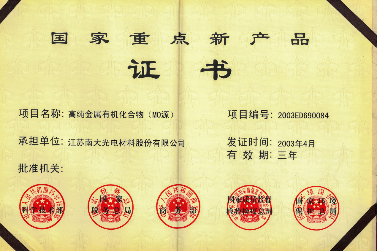 高純金屬有機(jī)化合物(MO源)獲得科技部頒發(fā)的“國(guó)家級(jí)火炬計(jì)劃項(xiàng)目證書(shū)”。