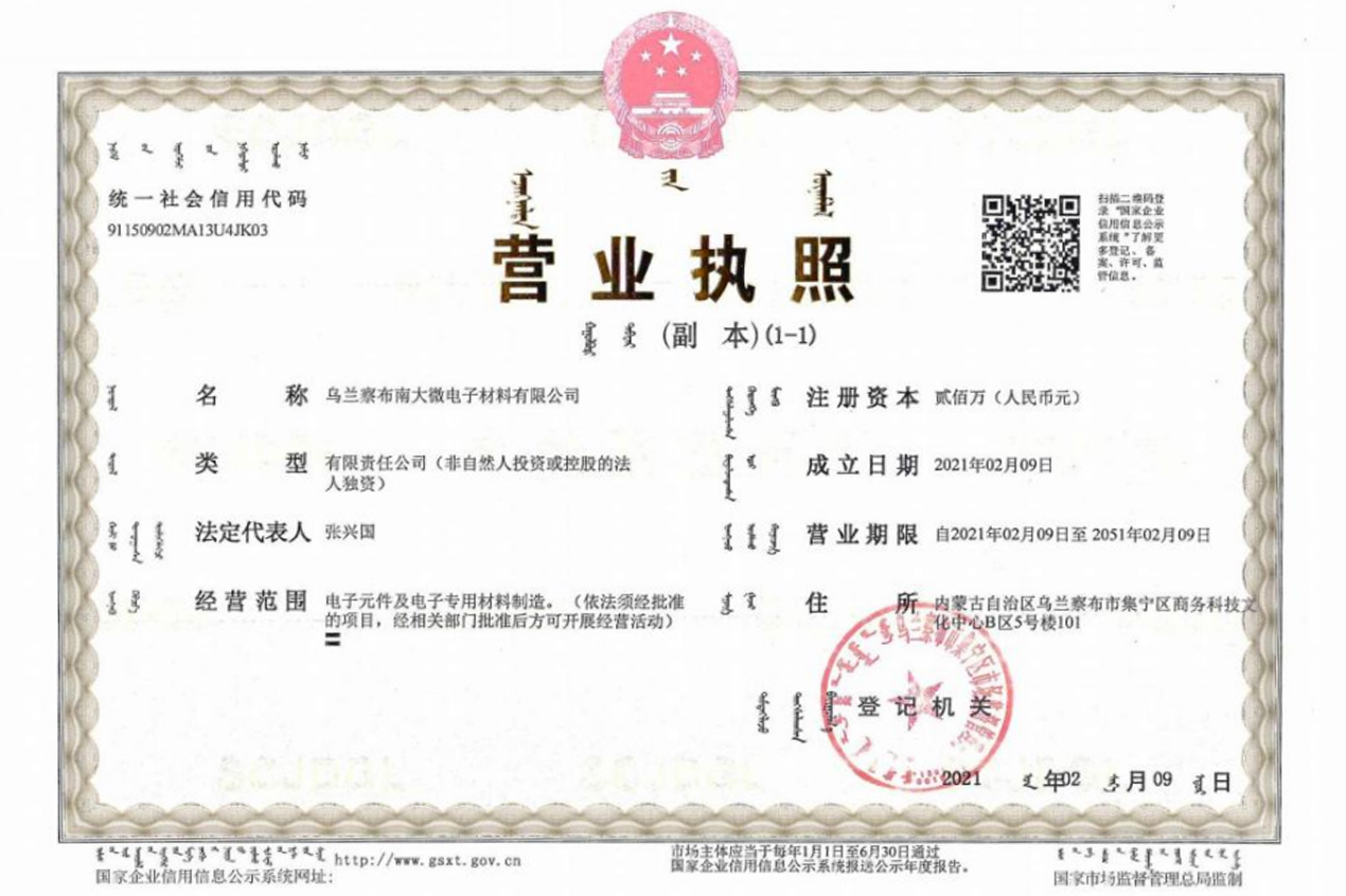 烏蘭察布南大微電子材料有限公司成立。